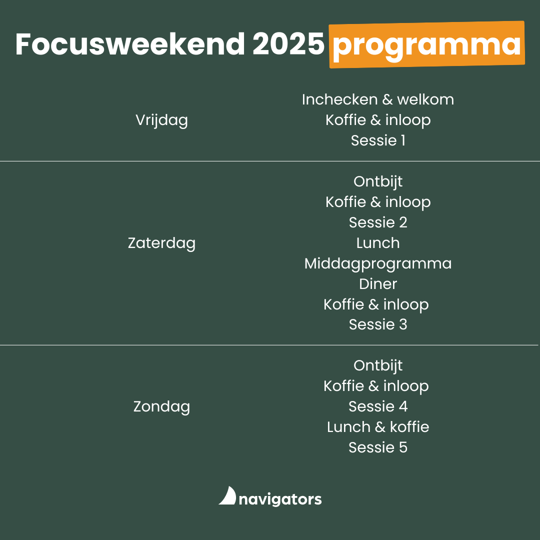 Foto’s en video’s maken mag met je telefoon, maar professionele apparatuur is niet toegestaan. Op deze dag is er een professionele foto- en videograaf aanwezig. We delen de beelden met je. Let op: met het kopen van een ticket voor het Focusweekend via Eventix geef je ook toestemming om gefilmd en/of gefotografeerd te worden.